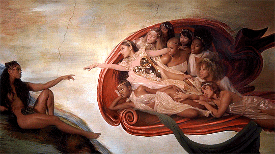 Next, is the significant scene in her music video where she paraphrases the Book of Ezekiel from the bible, using Madonna’s monologue, “I will Strike down upon thee, with great vengeance and furious anger, those who attempt to poison and destroy my sisters, and you will know my name is the Lord, when I lay my vengeance upon you” (Ezekiel 25:17). This verse is also a part of Samuel L. Jackson’s monologue in Quentin Tarantino’s crime film, Pulp Fiction. The only difference between the two is that Madonna’s monologue is spoken from a feminist’s point of view. She then throws a hammer towards a glass ceiling damaging it, thus inspiring women to break the glass ceiling. The video then ends with Ariana recreating Michelangelo’s Creation of Adam, replacing men with women and replacing herself as God, making her last gesture of feminine greatness. Overall, God is a Woman mostly appeals to women and can appeal to men as well. Her music video powerfully affects the persuasion of her audience, causing everyone to rethink and defy gender stereotypes, captivating the audience’s interest through pathos. With Ariana’s reputation as a feminist, it is more likely to know what to expect from her when watching and listening to her music.
